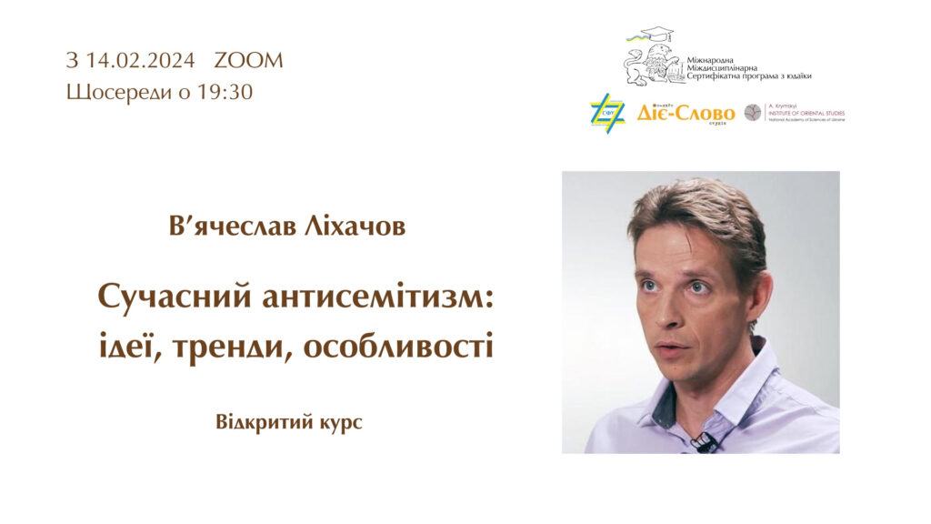 Міжнародна міждисциплінарна сертифікатна програма з юдаїки у співпраці з Інститутом сходознавства ім. А. Кримського НАН України, Студією “Діє-Слово” за підтримки Сіоністської Федерації України (СФУ) 14 лютого 2024 р. розпочинає відкритий курс “Сучасний антисемітизм: ідеї, тренди, особливості”.
